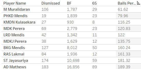 His Six hitting ability in the long format is well known, but here is a chart of Sri Lankan Batters who have the fewest 'balls per 6' (developed with Tableau). No wonder he was Shoaib Akthar's toughest batter to bowl at! Here's a video of a cameo by Murali, with some of his unconventional strokes.