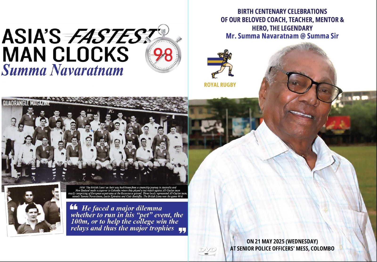 He was once the Fastest Man in Asia as a sprinter, and was equally fast as a wing three-quarter for the Ceylon team as a ruggerite, Sumanthiran Navarathnam - a legend who lived for 98 years and saw his legacy immortalised at his Alma Mater!