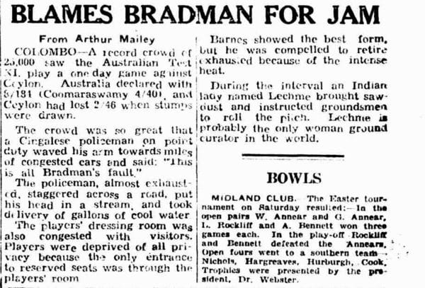 In fact, Australia visited Ceylon as 'Whistle Stops' (stopping at Ceylon and India before making the long ferry ride to England for the Ashes) 4 times - in 1930, 1934, 1938 and 1948, but Bradman only played twice in 1930 and 1948. He was out on hit wicket in the very first ball in 1930 but what happened 18 years later is a hilarious encounter that made headlines for a number of reasons.