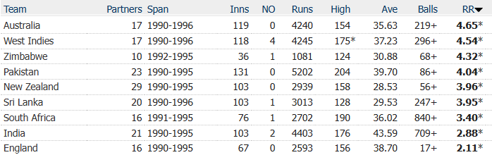 Up until the 8th of January 1996, the average opening pair partnership in ODIs was only 3.8 runs per over (RPO) with Australia being the highest scorers at the time with 4.65 RPO, followed by West Indies who were in second place with 4.54 RPO (considering the period of 1st January 1990 to 8th January 1996). Zimbabwe (with much less matches played) and Pakistan were the only other teams in excess of 4 RPO while Sri Lanka was a tad behind New Zealand.